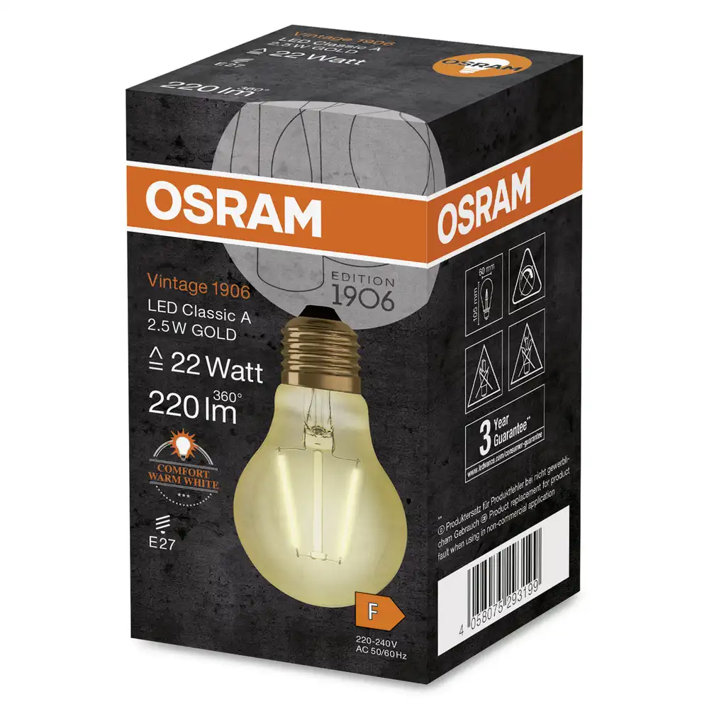 OSRAM LED žárovka filament Vintage.1906 A60 2.5W/22W E27 2400K 220lm NonDim 15Y