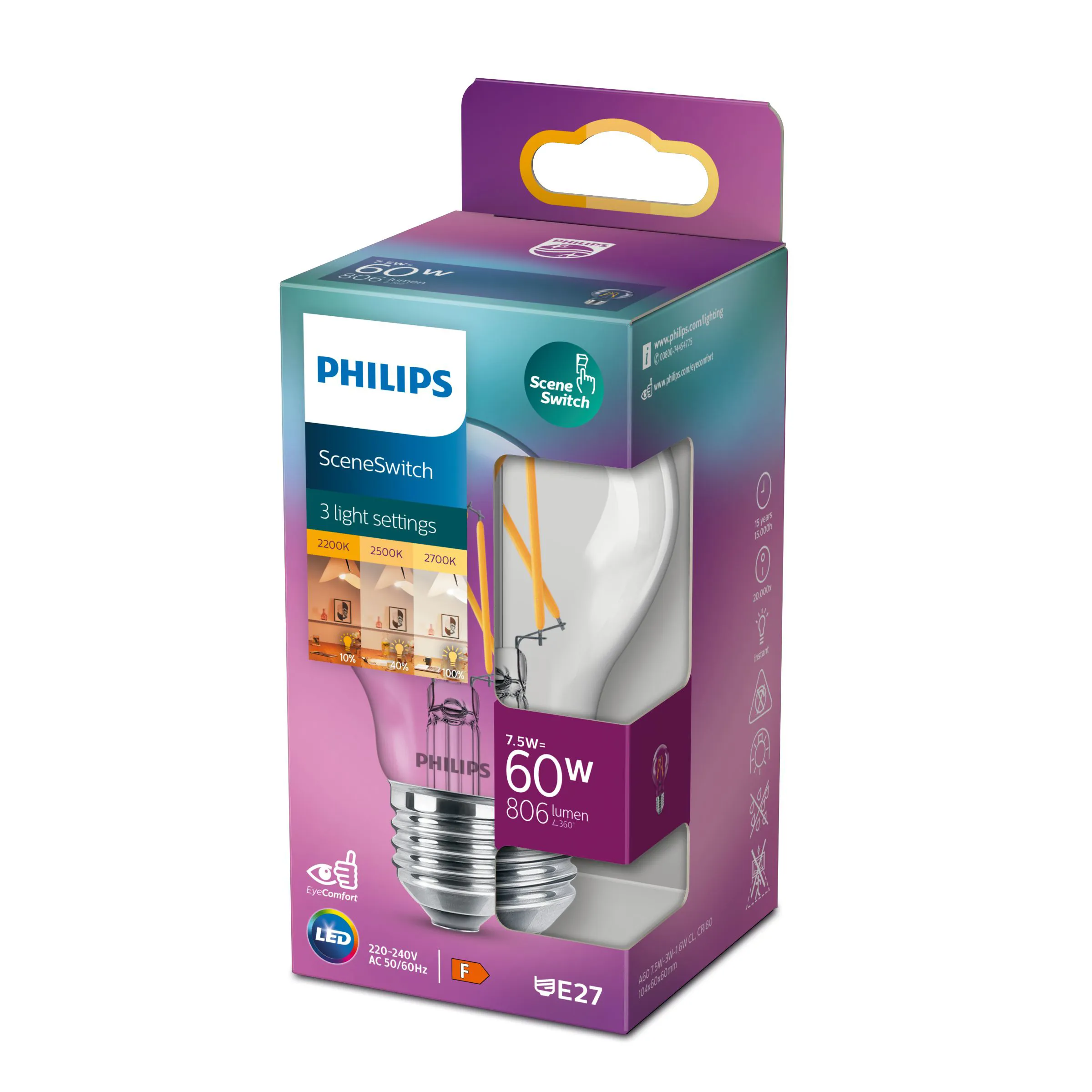 PHILIPS LED žárovka SSW A60 7.5W/60W E27 2700-2200K 806lm NonDim 15Y čirá BL